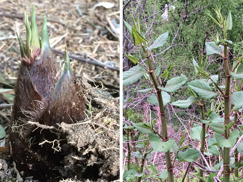 タケノコとイタドリです。でも、タケノコは勝手に取ったら怒られそうなのでぐっと我慢。